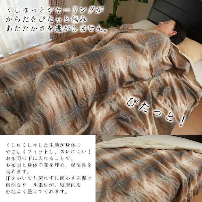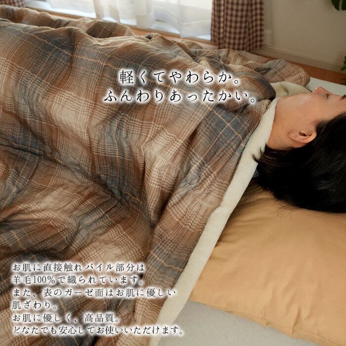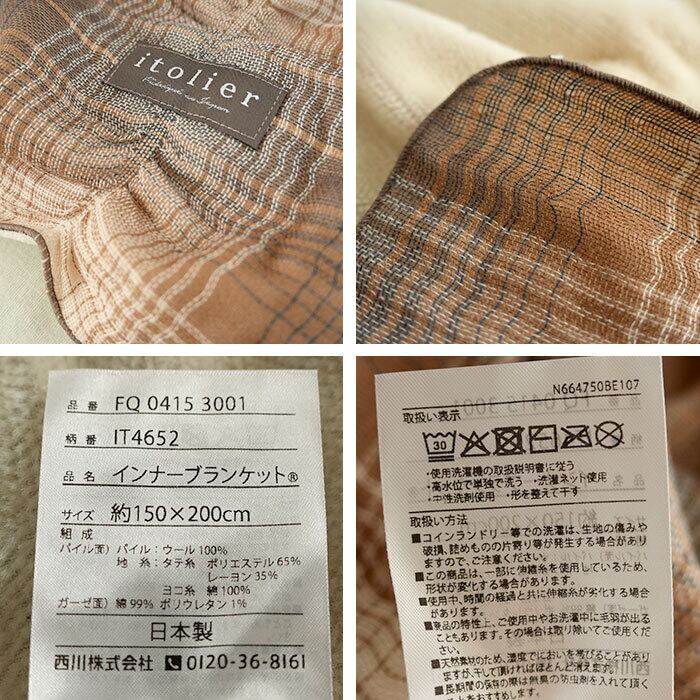 西川 毛布 ウールインナーブランケット くしゅっとガーゼ 150×200cm 毛布 軽量毛布 あったか毛布 柔らか毛布 ウール100% インナーケット チェック柄 イトリエ 日本製 10便 FQ04153001