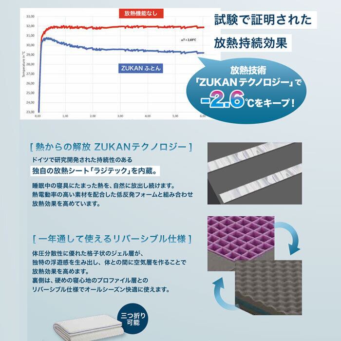 ZUKANフトンは、寝床内の熱を逃がし表面温度を2.6℃低く保つ、