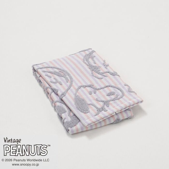 ガーゼ地に無撚糸パイルでスヌーピーと仲間たちが浮き出るデザイン。