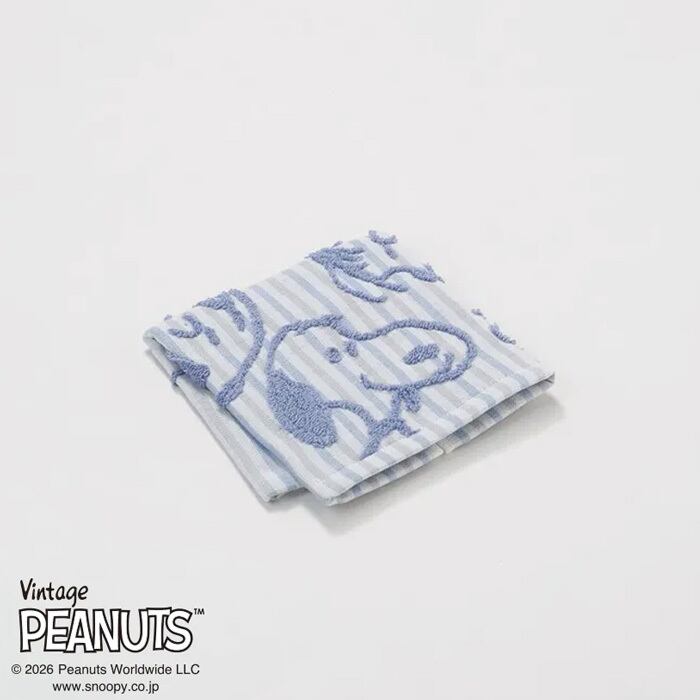 ガーゼ地に無撚糸パイルでスヌーピーと仲間たちが浮き出るデザイン。