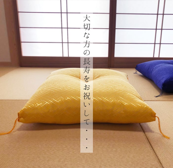 ふとんのとみながは、お祝いのあとも長く使っていただきたいとの思いから普段使いしやすい銘仙判(めいせんばん)サイズの祝寿座布団をつくりました。
