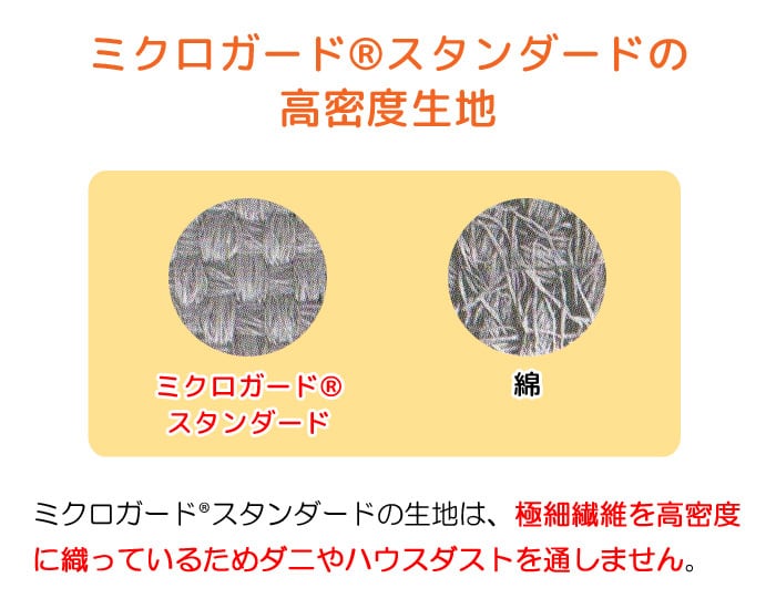 ミクロガードスタンダードの生地は、極細繊維を高密度に織っているためダニやハウスダストを通しません。