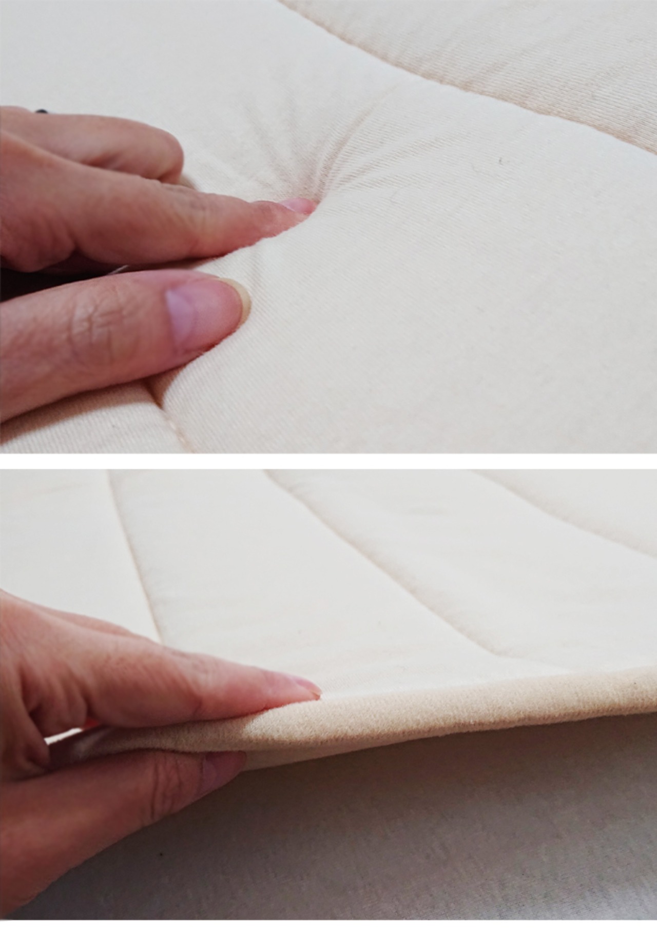 側生地にニット生地を使い、中綿に帝人のブイラップを使用することでもっちり感が気持ちいよくベッドパッドの寝心地UP!
