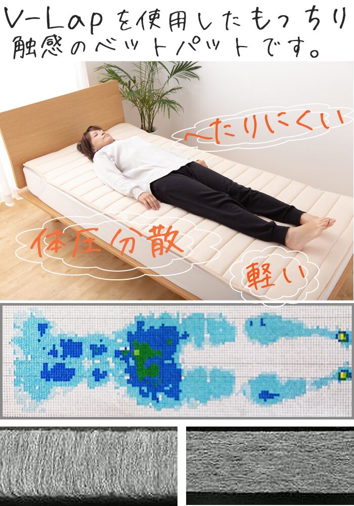 快適繊維クッション材のV-lapは、軽量でへたりにくく高反発性があり体圧分散にも優れているため 睡眠時にかかる体圧をうまく逃がしてくれ肩こりや腰痛の原因を軽減させてくれ快適な寝心地に導いてくれます。