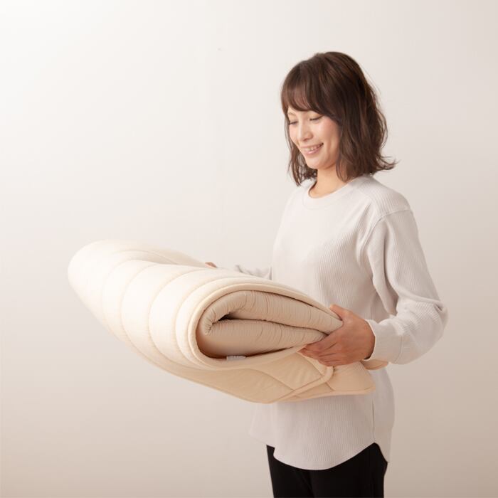 側生地にニット生地を使い、中綿に帝人のブイラップを使用することでもっちり感が気持ちいよくベッドパッドの寝心地UP!