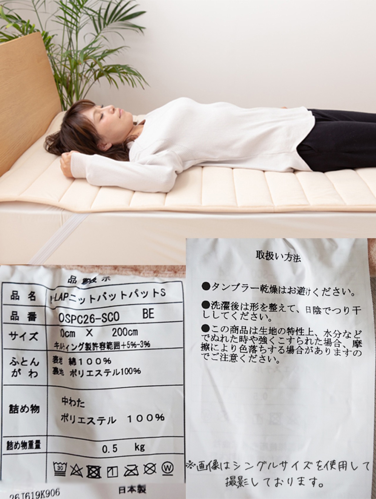 側生地にニット生地を使い、中綿に帝人のブイラップを使用することでもっちり感が気持ちいよくベッドパッドの寝心地UP!