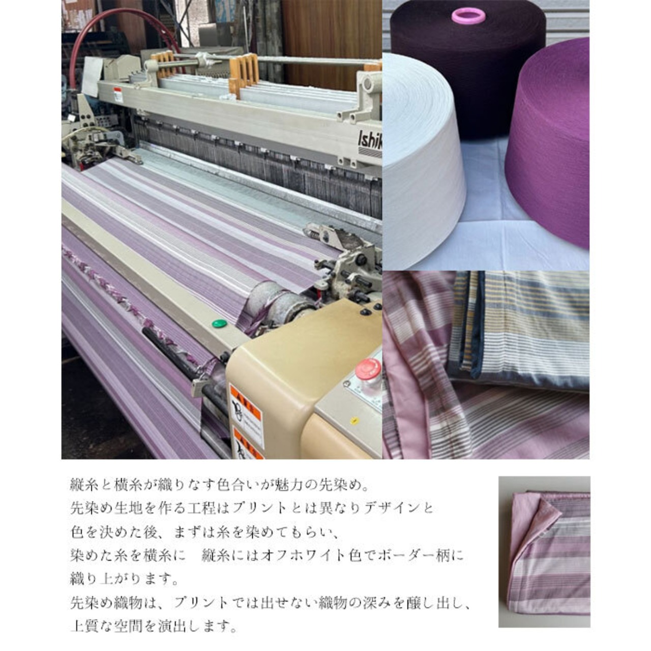 先染め生地を作る工程はプリントとは異なりデザインと色を決めた後、まずは糸を染めてもらい、染めた糸を横糸に 縦糸にはオフホワイト色でボーダー柄に織り上がります。