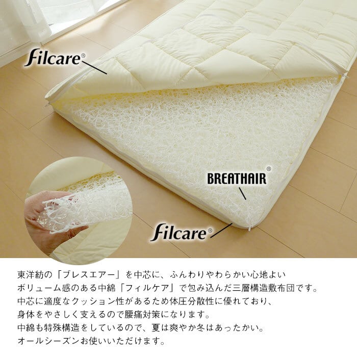 東洋紡の「ブレスエアー」を中芯に、ふんわりやわらかい心地よいボリューム感のある中綿「フィルケア」で包み込んだ三層構造敷布団です。